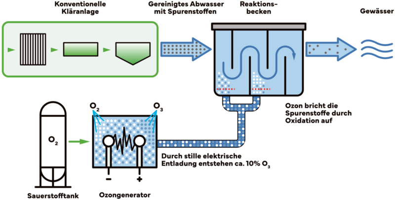 Für die Ozonbehandlung kann Ozon vor Ort aus Flüssigsauerstoff oder aus getrockneter Luft erzeugt werden. Die Dosierung von Ozon kann sowohl durch den Eintrag über einen Injektor als auch über ein Diffusorsystem erfolgen. Bei der Behandlung des Abwassers mit Ozon zur Oxidation von Spurenstoffen entstehen Metabolite und Transformationsprodukte, deren öko- und humantoxikologische Wirkung bisher noch nicht ausreichend erforscht worden sind. Daher wird